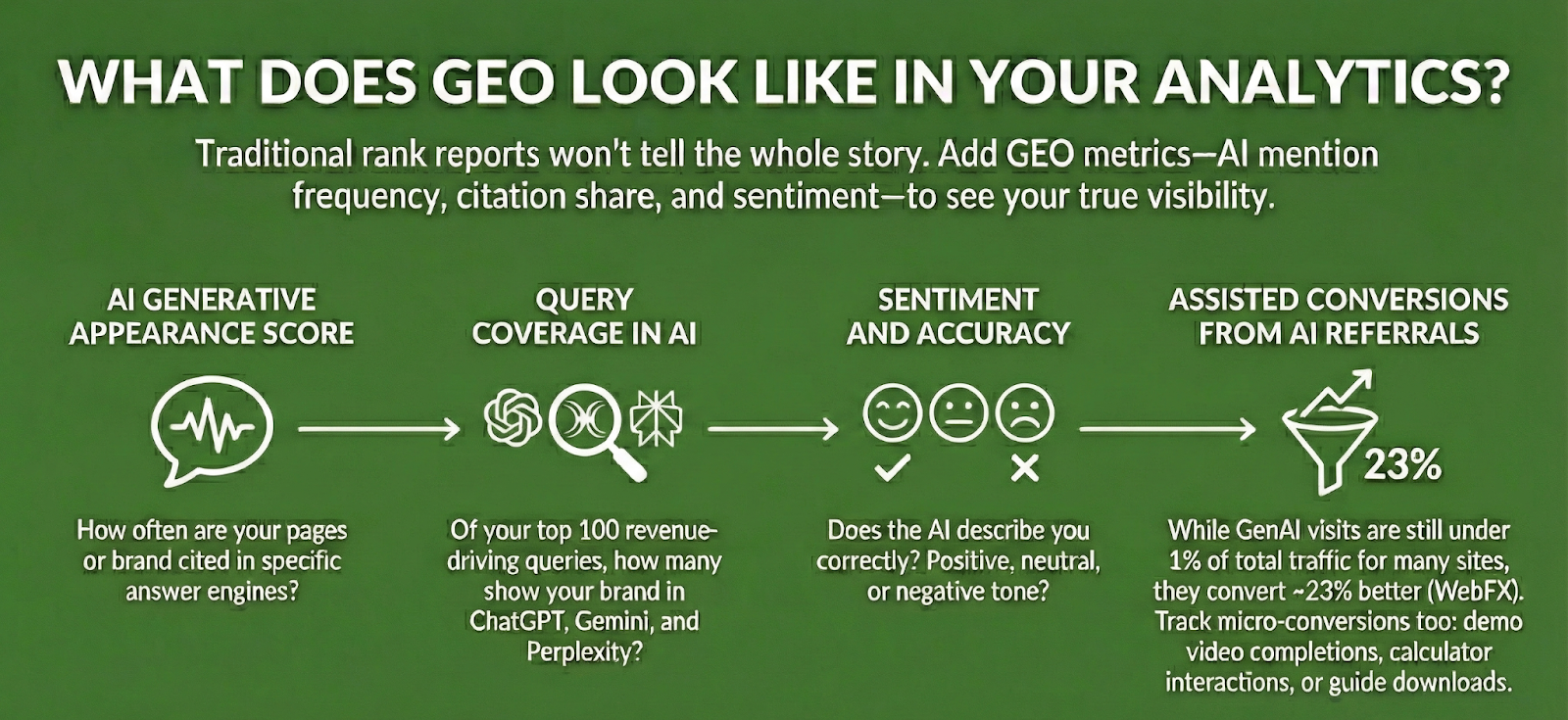 - Assisted conversions from AI referrals: while GenAI visits are still under 1% of total traffic for many sites, they convert ~23% better (WebFX). Track micro-conversions too: demo video completions, calculator interactions, or guide downloads.