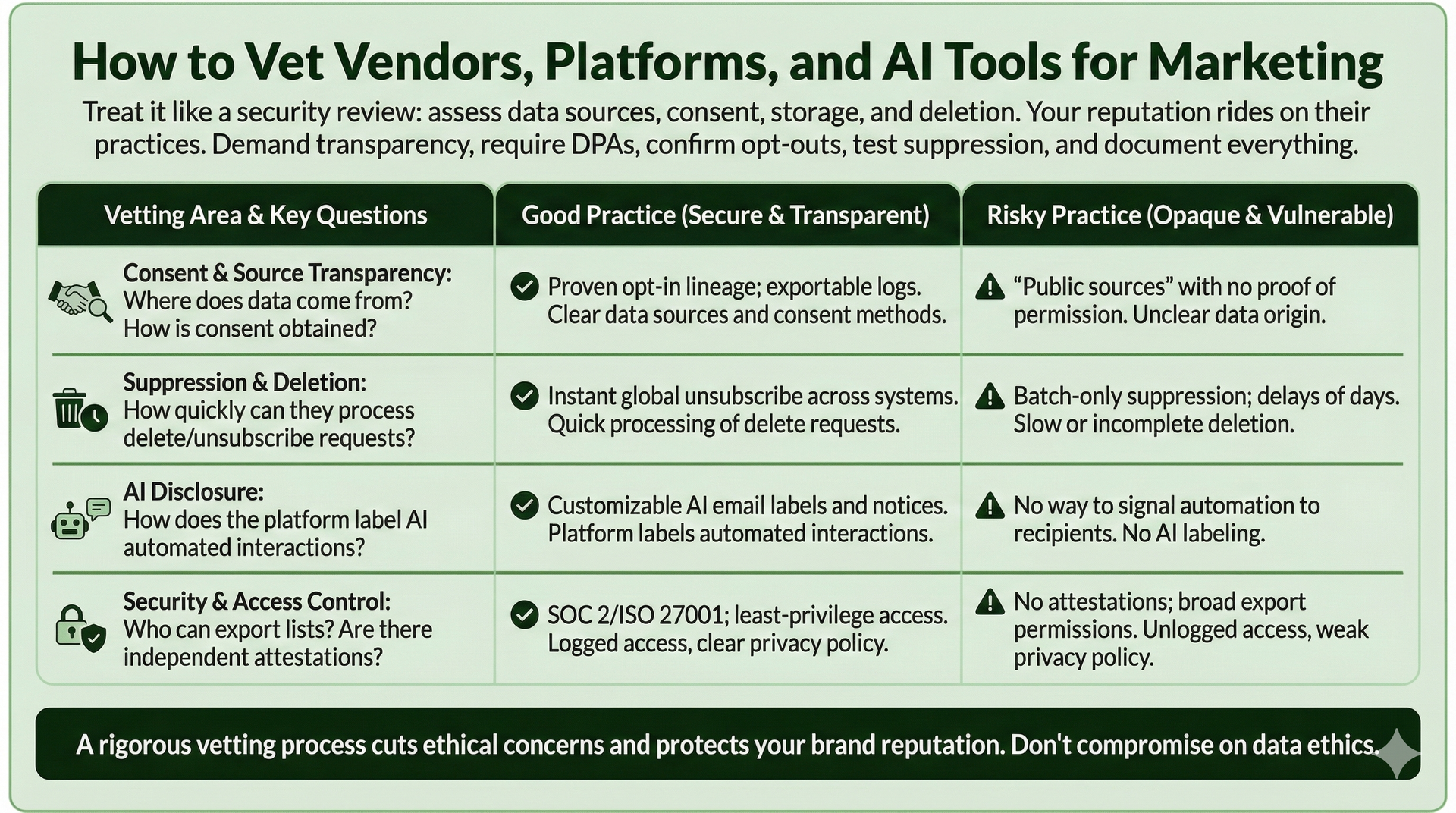 Direct answer: demand transparency on data collection methods, require DPAs, confirm opt-out mechanics, test suppression, and document everything. This cuts ethical concerns substantially.
