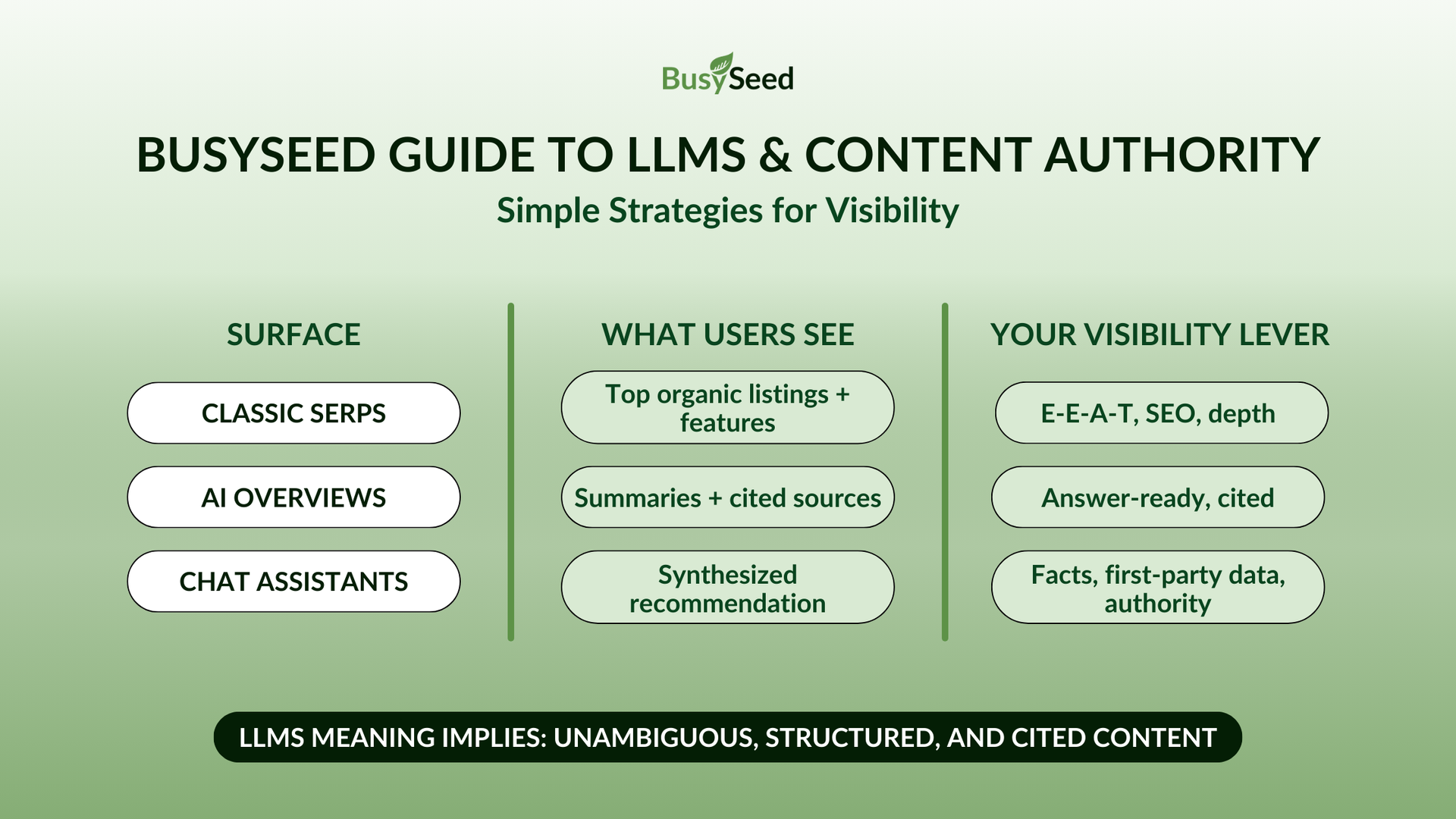 Measure what matters. Your AI ranking isn’t just a position number; it’s also its presence in AI overviews and chat responses. Keep a dynamic list of priority questions and test them in ChatGPT, Gemini, and Copilot. The LLMs meaning for operations is simple: Trusted, structured, and fast content wins; ambiguous, slow, or unclear content gets sidelined. If you want a team that already works across these layers, explore how BusySeed approaches integrated growth and AI visibility. We’re ready when you are!
