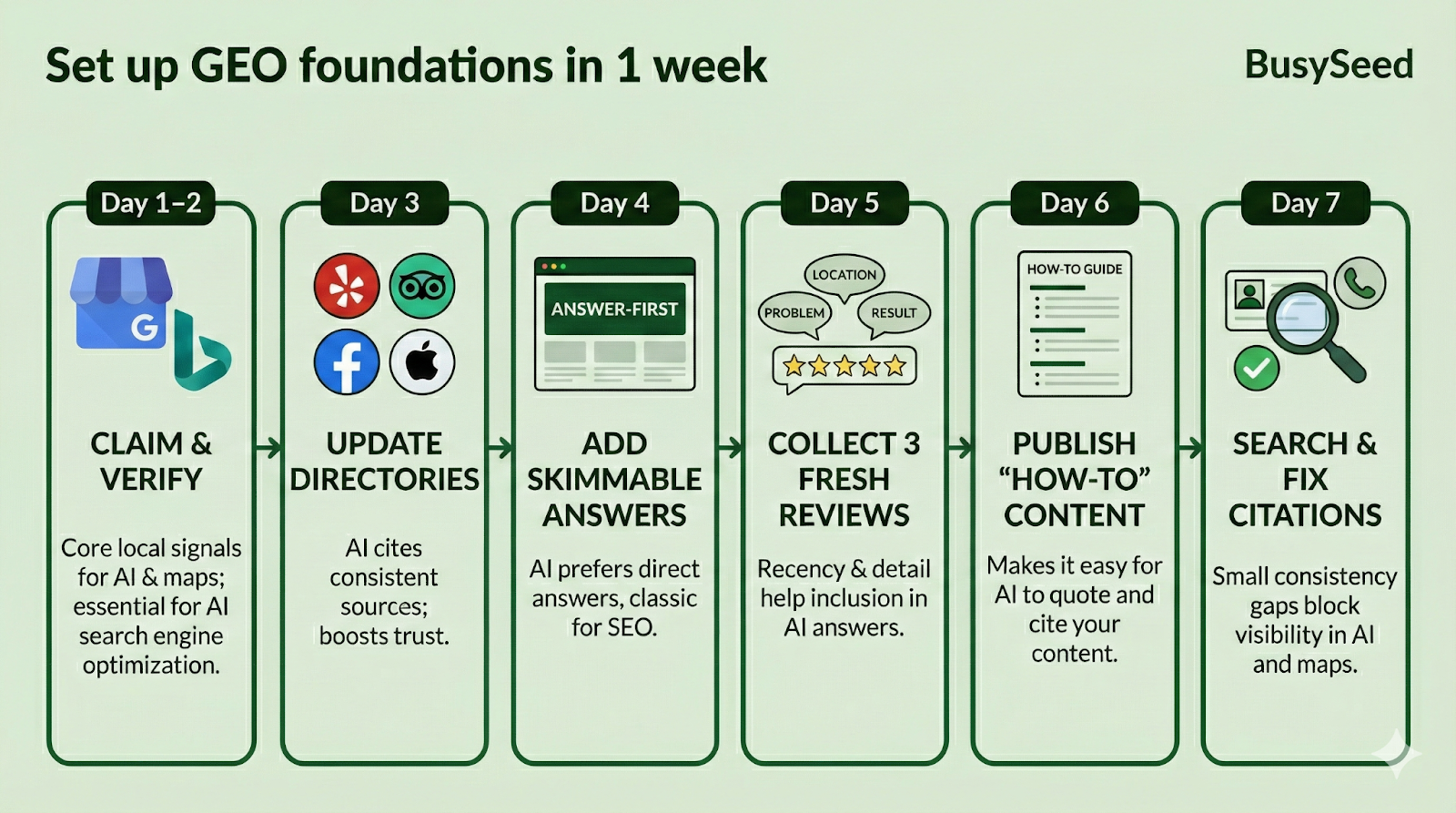You don’t need to do everything at once. Here’s a compact plan any busy owner can follow. If you want this done with you or for you, our Top GEO marketing guides map each step, and the team at BusySeed can help.