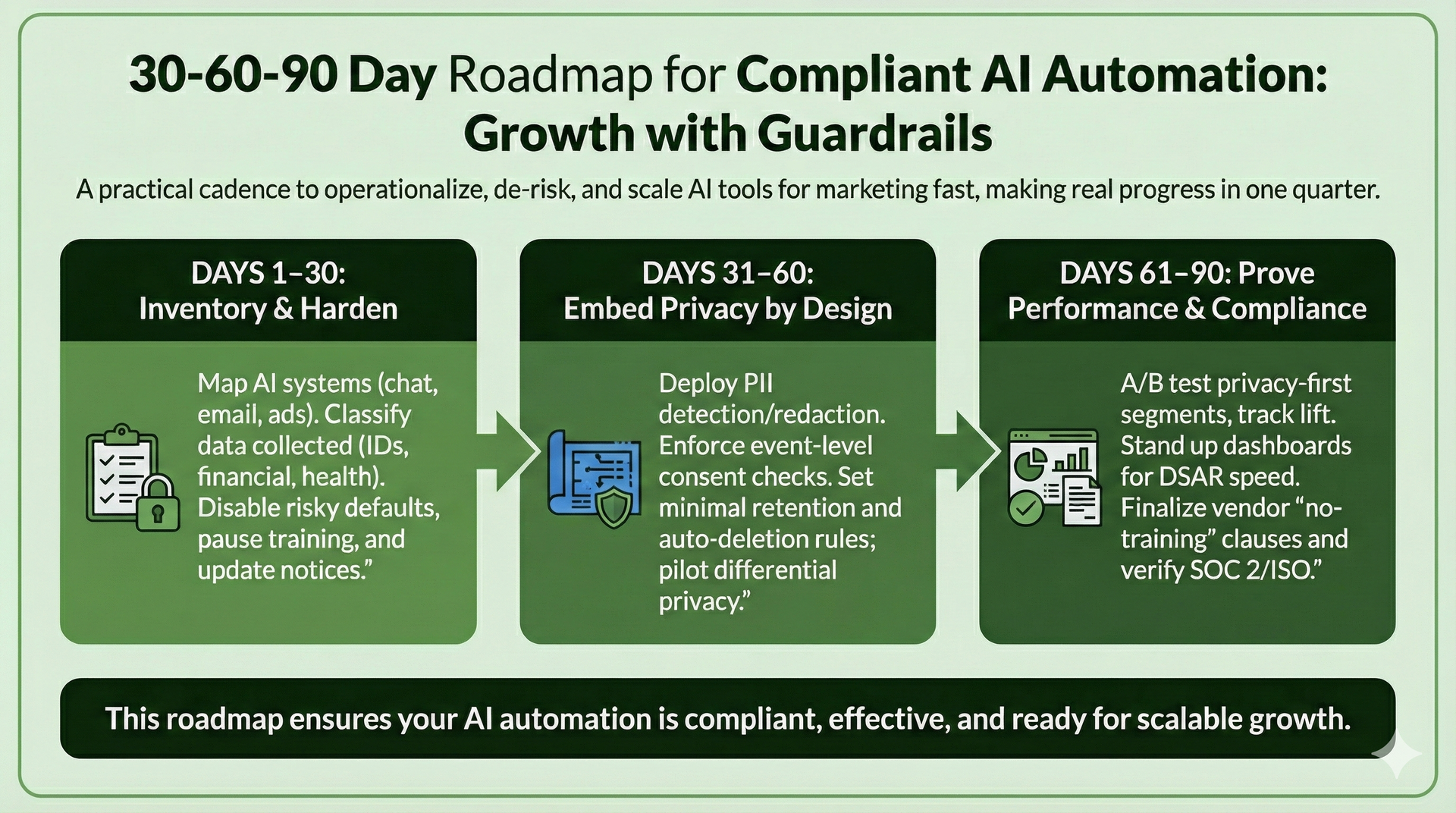 | 61–90 | Prove Performance & Compliance | A/B test privacy-first segments, track lift and opt-outs. Stand up dashboards for DSAR speed, consent coverage, and data minimization. Finalize vendor “no-training” clauses and verify data privacy and security with SOC 2/ISO and DPIAs. |