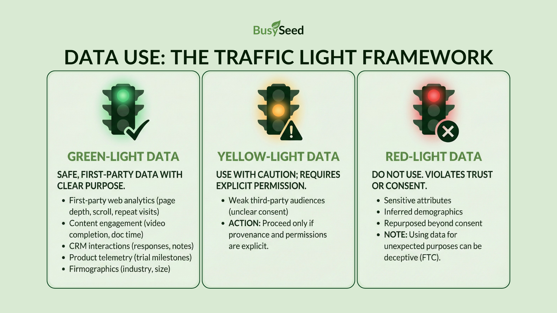 - Yellow-light data: Weak third-party audiences without consent clarity; proceed only if provenance and permissions are explicit.