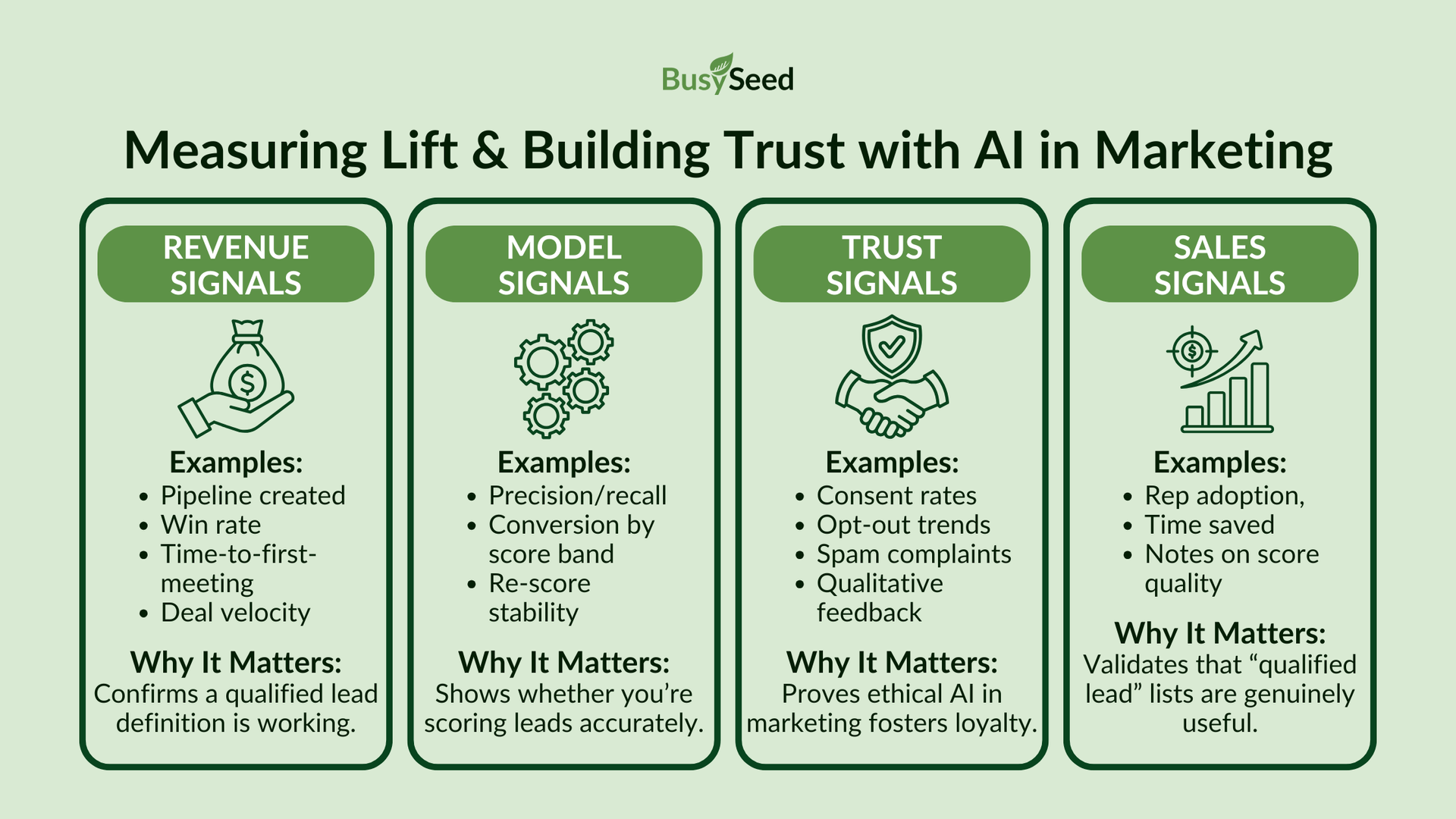 | Trust signals | Consent rates, opt-out trends, spam complaints, qualitative feedback | Proves ethical AI in marketing fosters loyalty |